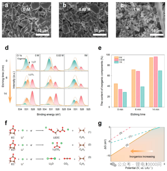 Mechanism Calculations (DFT): To provide a theoretical explanation, the team calculated the Gibbs free energy changes of the decomposition pathway of EC (ethylene carbonate), a common solvent in the electrolyte, at different potentials (Figures 4f-g). The calculations showed that at higher reduction potentials (overpotentials), the decomposition of EC to produce inorganic compounds such as Li₂CO₃ and Li₂O is thermodynamically dominant, theoretically supporting the conclusion that high overpotentials promote the formation of an inorganic-rich SEI.