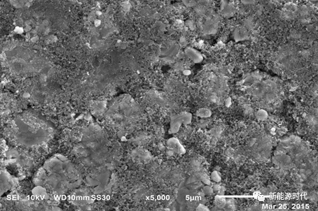 SEM images show that the primary particles of the positive electrode active material are approximately 1 μm in size, agglomerated into spherical shapes, and coated with SP particles. The negative electrode active material is coated with an SEI film and lithium oxide, appearing as a sheet, thus eliminating the mesophase carbon microspheres.
