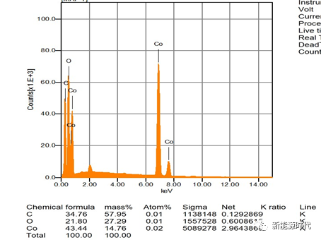 According to EDS results, the positive electrode partial scan showed only C, Co, and O elements, confirming it as LiCoO2 material.
