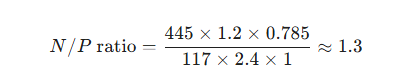 Based on the N/P ratio calculation formula and the specific capacities of the anode and cathode materials, assume the following: