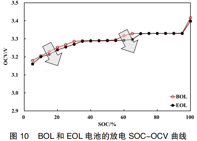 This is primarily because the capacity fade in EOL batteries reduces the amount of lithium ions intercalated into the graphite anode compared to BOL batteries at the same SOC. Consequently, the anode potential is higher, leading to a decrease in the overall OCV value. This results in the drop in the anode potential of the EOL battery lagging behind that of the BOL battery. When the BOL battery has almost completed its OCV voltage step, the EOL battery is only just beginning the step.