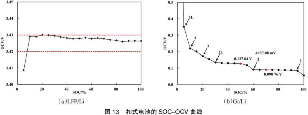 In order to distinguish the correlation between the full-cell SOC-OCV curve and the individual contributions of the positive and negative electrodes, LFP/Li and Gr/Li coin cells were prepared. Their measured SOC-OCV curves are shown in Figure 13. Following the de-intercalation of lithium ions from the positive electrode, lithium iron phosphate (LiFePO4) transforms into iron phosphate (FePO4). As seen in Figure 13(a), when SOC ≥ 10%, the positive electrode potential exhibits minimal variation, with the OCV fluctuating within a range of less than 10 mV.