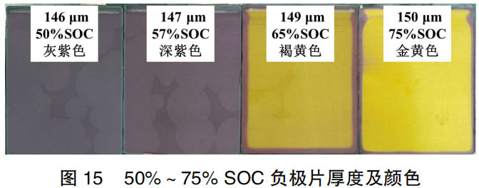 Figure 15 shows the changes in the thickness and color of the negative electrode plates within the 50%–75% SOC range. As observed in Figure 15, with the increase of SOC, the color of the electrode plates transforms from blackish-purple → deep purple → deep yellow → golden yellow, accompanied by a slight increase in electrode thickness. Following the OCV voltage step in the full cell from 57% SOC to 65% SOC, the majority of the electrode plate—excluding the edges—changes from deep purple to deep yellow. The thickness increases by only 2 μm, indicating that the transformation of graphite intercalation compounds (GICs) at this stage has a minimal impact on the graphite interlayer spacing.