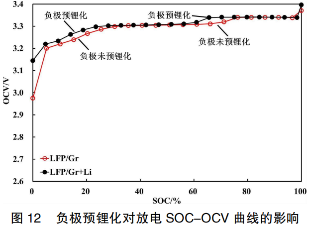 Figure 12 presents the discharge SOC-OCV curves for the two battery systems: LFP/Gr and LFP/Gr+Li. It can be observed that when SOC ≤ 30%, the battery OCV is significantly improved, especially at 0% SOC. This is because after lithium replenishment (pre-lithiation) of the anode, a portion of active lithium ions remains stored within the negative electrode even when discharged to 0% SOC; consequently, the anode potential remains relatively low, resulting in a higher full-cell OCV. Furthermore, after anode lithium replenishment, the phase transition in the 60%–75% SOC range occurs earlier, causing the OCV voltage step to appear prematurely and the curve to shift to the left.