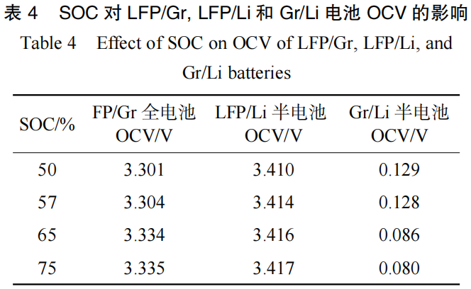 Storage and charge-discharge cycling can cause capacity fade, leading to a rightward shift in the SOC-OCV curve. Similarly, doping the negative electrode with silicon-oxygen (SiO) materials increases the anode potential, causing a rightward shift. Conversely, using lithium strips for pre-lithiation decreases the anode potential, causing the SOC-OCV curve to shift to the left. The SOC-OCV curve of the full cell is primarily determined by the negative electrode. The OCV voltage step of approximately 35 mV observed near 60% SOC originates mainly from the phase transition of the lithiated graphite anode and has little correlation with the LFP cathode.