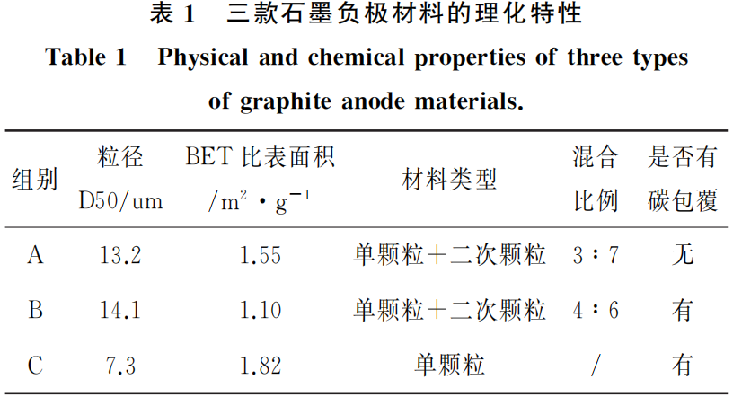 The physical and chemical characteristics of the three graphite anode materials are summarized in Table 1. Since particle size, particle morphology, and carbon coating treatments significantly influence the kinetic performance of graphite, these three distinct types of graphite materials were selected for comparative analysis.