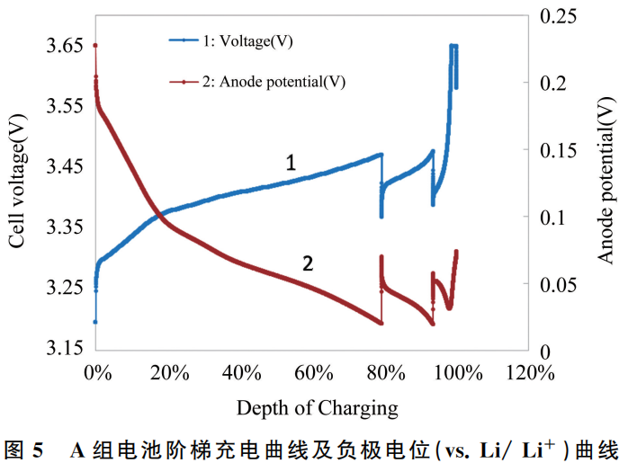 Group A batteries were selected for the multi-step charging study. The resulting curves are shown in Figure 5, and the statistical data from the step-charging process is summarized in Table 3.