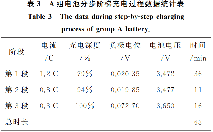The data indicates that by employing a multi-step charging strategy with varying currents (1.2C, 0.8C, and 0.3C in sequence), the total charging duration is 63 minutes, which is essentially consistent with the time required for conventional 1C CC-CV (constant current-constant voltage) charging. At the end of the charging process, the anode potential is 0.0727 V, which remains above the lithium plating potential (0 V), thereby reducing the risk of anode lithium plating. Consequently, this charging method ensures both charging efficiency and battery performance without increasing the overall charging duration.