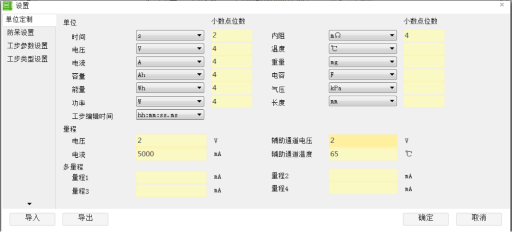 Unit Customization: For unit settings, if accuracy is not critical, refer to Figure 3. In range settings, focus primarily on voltage, auxiliary channel voltage, and current. Set these values according to the battery parameters being tested, ensuring they exceed the voltage and current limits during charging and discharging. Note: The unit customization interface allows setting units for parameters such as voltage, current, and power. For example, current can be set to μA, mA, A, or kA. Alternatively, the unit customization interface can be accessed by right-clicking on a channel and selecting “Unit settings.”