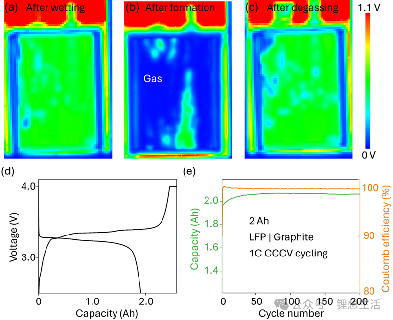 Figure 4 further presents ultrasonic images of the cells after formation, degassing, and secondary encapsulation. It can be seen that the electrolyte was uniformly distributed, with no local dry areas or bubble accumulation—proving the controllability and repeatability of this strategy.