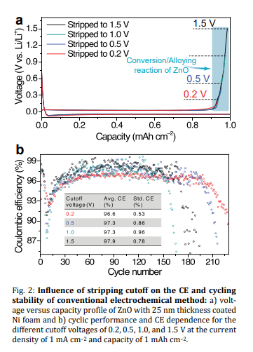 Cutoff: Despite the fact that the average CE decreases by lowering the upper cutoff potential in the conventional electrochemical method, the cycle life can be extended. In other words, increased high cutoff potentials lead to reduced lifespan due to the further decomposition of electrolytes and irreversible electrochemical reactions. Accordingly, the lower cutoff voltage is recommended for lithium plating and stripping tests.