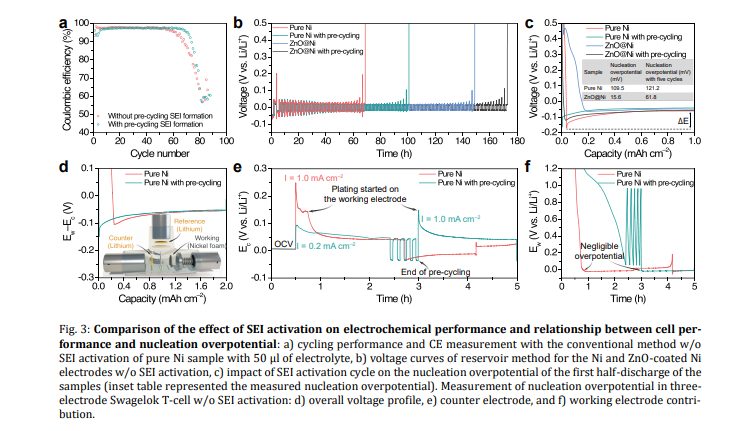 Nucleation overpotential: The results from three-electrode cells indicate that the energy barrier for stripping or extracting lithium from the lithium metal counter electrode is significantly higher than the energy barrier for forming nucleation sites on the working electrode when the cell starts cycling. This also explains why the pre-cycling to form initial SEI induced a higher nucleation overpotential.