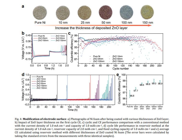 Modification of electrode surface: The optimal thickness of ZnO coating on the Ni foam current collector was shown to be below 50 nm when using the conventional method, whereas increasing the thickness improves the performance in the reservoir method. The results indicate that the lower thickness of ZnO would be more suitable for use in AFBs with a limited source of lithium in the cathode electrode, whereas a higher thickness of ZnO would be more beneficial for infusing molten lithium to use as an anode in the LMBs. In general, it is challenging to determine the effective optimal thickness of coatings in modified materials.
